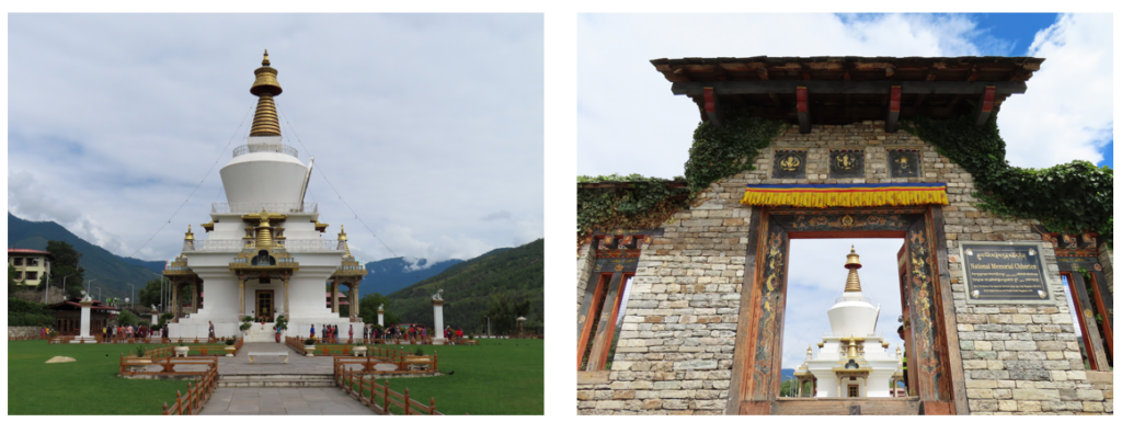 Na de weverij reden wij naar de Memorial Chorten. De stoepa is gebouwd in 1974 ter ere van de derde koning, in Tibetaanse stijl met bovenop de gouden spits. Na de ingang door een mooie poort kom je op een groot complex met een tuin, de stoepa, mooie grote gouden gebedsmolens, een tempeltje om boterlampen te branden en een paar nog wat kleinere gebouwen en beelden. Begonnen met drie rondjes om de gebedsmolens, ze waren best zwaar. Tussen de gebedsmolens zaten wat monniken en ouderen te bidden. De tempel waar je boterlampen kunt aansteken is van binnen redelijk zwart geblakerd, de warmte van de vele brandende boterlampen komt je al meteen tegemoet. Je kunt drie boterlampen ontsteken voor 100 NG, ik heb er ook drie aangestoken, het voelde goed om dat te doen. De lampen worden aangestoken om verlichting te vinden. Vroeger werden de lampen gemaakt van yakboter, tegenwoordig maakt men gebruik van plantaardige olie.