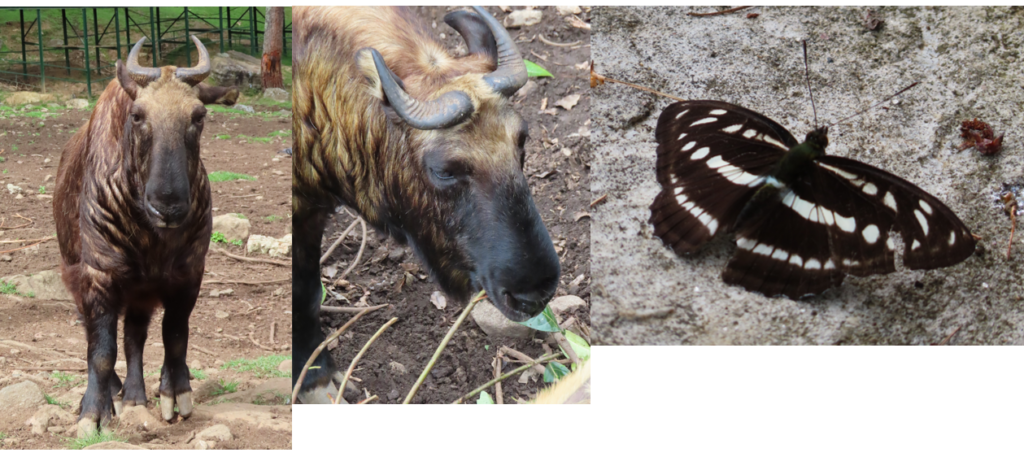 Na alle mooie heiligheden nu even tijd voor het nationale dier van Bhutan, de Takin. Het bijna mythische dier, lijkt nog het meest op een koe met de kop van een flinke geit, is te bewonderen in het Royal Takin Reserve, een kleine dierentuin. Via stevige groene constructies loop je naar het verblijf van de Takin. Op de hekken leuke, humoristische opmerkingen om te zorgen dat de Takin zo min mogelijk wordt gestoord, “No loud Music please! Our animals are not very fond of partying”. Er lopen aardig wat Takins rond, ook een paar jongen, rare beesten. Door grote gaten in het hekwerk kun je leuke foto’s maken. Het voederen van de Takin is verboden, ze staan op streng dieet om er goed uit te blijven zien (volgens een bordje op het hek). Wij hadden best wel wat tijd in de dierentuin en met samen met Betsie het pad na de Takins verder gevolgd. Onderweg een mooie zwart-witte vlinder op de foto gezet, later bleek dat dit een heel bijzonder exemplaar is, de Sergant vlinder. Het pad eindigt bij een volière met enkele grotere vogels, niet heel bijzonder en daarachter een koffietentje waar veel groepsgenoten al zat te wachten met een kop koffie en een taartje.