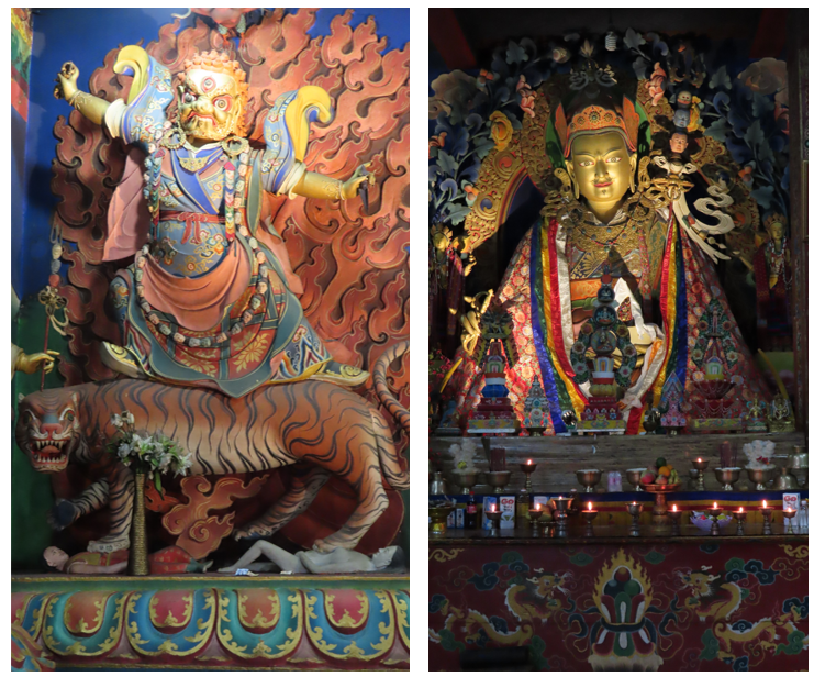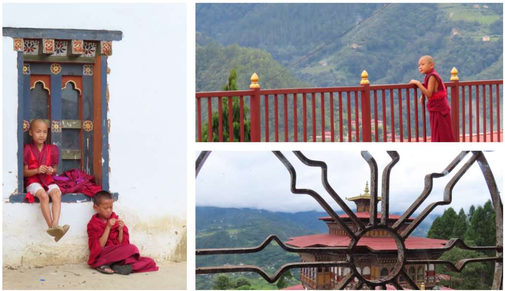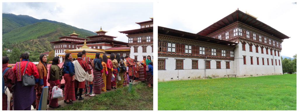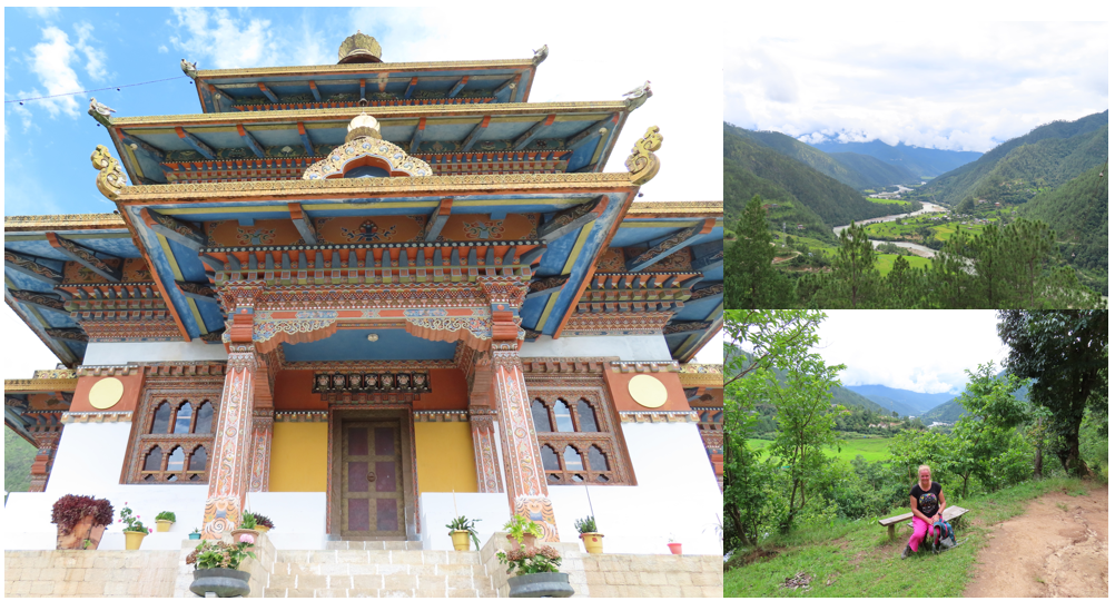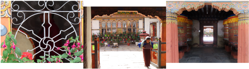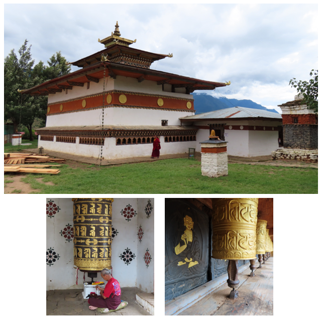 Het klooster mochten wij alleen gepast gekleed betreden, schoenen uit, lange kleding voor de benen en de armen. In de tempel worden Shabdrung Ngawang Namgyal (geestelijk leider) en Guru Rinpoche (de tweede Boeddha, de kostbare meester) vereerd, mooie, gouden, statige beelden. Beide zijn erg belangrijk geweest in het ontstaan, verenigen en de ontwikkeling van Bhutan, je komt ze in vele tempels en kloosters tegen. Buiten de tempel langs de muur staan een aantal mooie grote gebedsmolens. Met een goede zwieper aan de verschillende gebedsmolens het vredige “Oma Ni Pat Ne Hum” met de wind mee de wereld in geslingerd. Rond het klooster liep een oudere vrouw haar gebedsronden en een monnik was verdiept in zijn boek, verder was het er stil, alleen het serene geratel van de gebedsmolens was te horen.