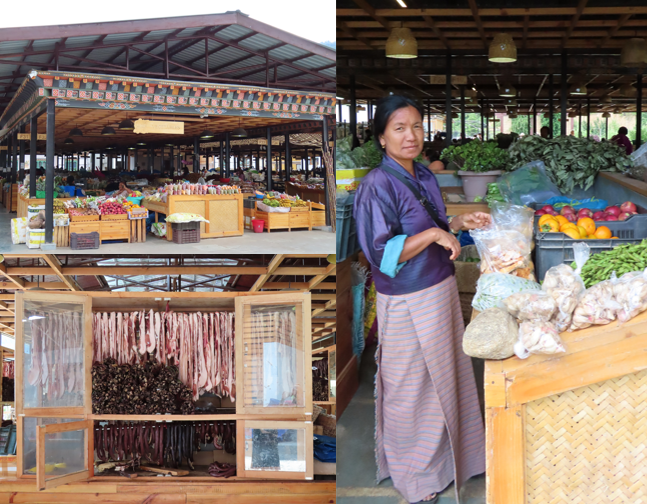 Na de lunch gingen wij naar de markt waar de lokale verse producten worden verkocht. Het is een grote, schone hal en erg fotogeniek. De mensen, de kinderen en de keurig opgestapelde handelswaar. Boven voornamelijk groente en fruit, beneden een paar kraampjes met gedroogd vlees en een paar met gedroogde vis. Aan de overkant van de weg, langs de markt dacht ik een leuke tempel te zien met een trap en een mooie hoge ingang. Gelukkig stond onze gids precies ook op dat punt en die vertelde dat het een voetgangersbrug over de rivier was. Aha! Nog beter! Ik had nog wat tijd en liep de trap naar de brug omhoog. Het is een mooie brede houten brug met aan beide kanten twee torens. In het midden van de brug is het even goed genieten van de kolkende massa onder je. Aan de overkant van de rivier is nog een markt. Aan de linkerkant typisch Bhutanese spullen en aan de rechterkant de textielmarkt. Ik had helaas geen tijd meer om de markt rond te lopen en ging weer terug naar de bus.