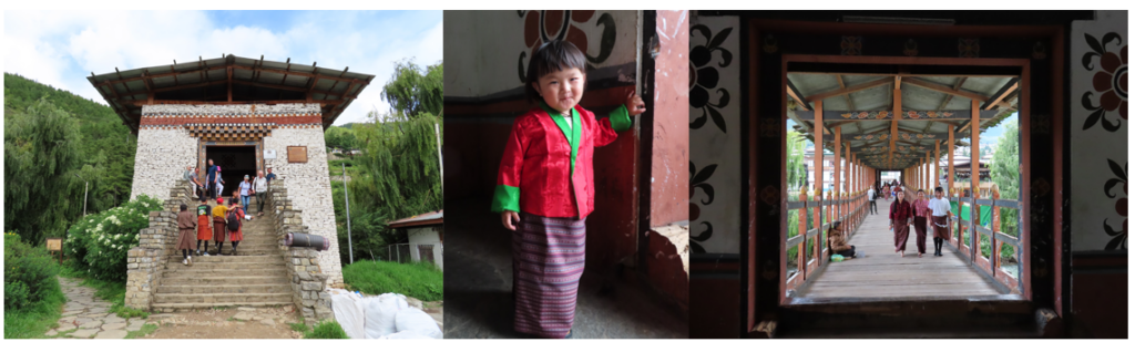 Via de mooie toegangspoort kom je op het mooi onderhouden, groene complex van de Khamsum Yuelley Namgyai Chorten. De chorten mag je alleen bedekt betreden, dus rok over mijn broek, jasje aan over mijn toch al bezwete lijf en hup de chorten in. De chorten heeft meerdere verdiepingen en Jigme gaf bij de eerste wat uitleg en daarna konden wij zelf op verkenningstocht. Het duurde acht jaar voordat de tempel in 1999 klaar was. De tempel is gewijd aan de vijfde koning en het ontwerp is van zijn vrouw. De chorten moet bescherming bieden aan Bhutan, je vindt er dan ook veel olifanten en religieuze figuren op snowlions, veelal omringd door een vlammenzee. Op de bovenste etage, het dak van de chorten kun je foto’s maken van de omgeving, maar niet van de Boeddha in het nisje in de tempel, want die staat IN de tempel, gelukkig kwam ik daar net op tijd achter. Op het dak even flink genoten, wat een prachtig groene omgeving, kolkende rivieren in de verte en een serene stilte. Na alle trappen weer afgedaald te zijn, mijn rok weer uitgedaan en mijn wandelschoenen weer aan en begonnen aan de afdaling naar beneden. Het eerste deel gaat via een andere weg, maar als snel loop je weer op hetzelfde pad als naar boven. Er waren nog best wel wat mensen die naar boven wilde en het was inmiddels pittig warm aan het worden. Op een strategisch bankje bij een mooi uitzichtpunt iedereen even laten passeren en ondertussen maar weer even genoten van het uitzicht en de zon. Beneden aangekomen nog wat beestjes gezellig op de foto gezet om vervolgens ook gelijk de lege brug maar even mee te pakken.