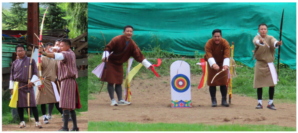 Onze laatste stop voor vandaag was bij de nationale sport van Bhutan, het boogschieten. Vlakbij het voetbalstation ligt de Archerybaan. Er werd druk gespeeld door een aantal mannen. Langs het veld staat een lange tribune en daar alles even zitten te bekijken. Aan de ene kant werden de pijlen afgeschoten en aan de andere kant stonden mannen bij het bord om de punten door te geven. Lang niet elke pijl kwam in het bord terecht of haalde überhaupt de overkant. Als de pijl niet in het bord kwam, gaven de mannen bij het bord dit aan door met hun handen naar beneden te wijzen. Haalde de pijl het dan strekte de mannen hun armen boven het bord uit. Waren er punten geschoord dan gingen de mannen naast elkaar staan wiegen. Erg leuk om mee te maken!