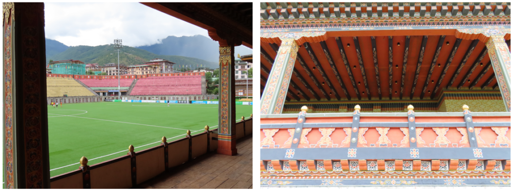 Weer terug bij de bus hadden wij de keuze, met de bus mee naar het hotel of lopen. Samen met wat groepsgenoten ging ik aan de wandel om zo onderweg naar het hotel nog wat leuke dingen mee te pakken. Als eerste kwamen wij in de feesttent die er was neergezet ter gelegenheid van het Timphu festival. Aan de zijkant veel mensen in gezellige zitjes en een DJ op het podium, het middenveld van de tent was vrijwel leeg. De tent stond voor het voetbalstadion, door wat spleten probeerde wij wat van de voetbalwedstrijd of training te zien. Niet veel verder vond ik een opendeur en wij glipten naar binnen. Het stadion is moderne en oude stijl gebouwd. Aan de overkant allemaal tribuneplaatsen met stoeltjes zoals je deze ziet in de huidige stadions en aan onze kant de VIP lounge, mooie geschilderde vertrekken, een lege ruimte waar tijdens de wedstrijden comfortabele stoelen worden geplaatst. Aan deze kant ter hoogte van de middenstip de tribune voor de koning.
