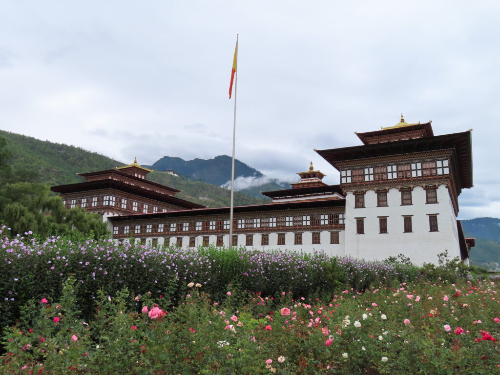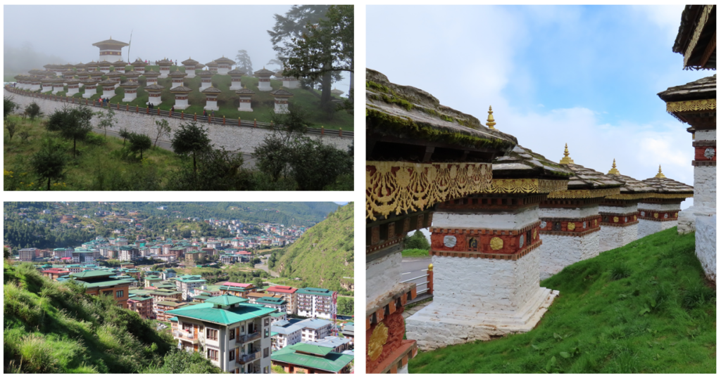Wij vertrokken weer met onze bus en na een goed half uurtje stopten wij bij de controlepost op de weg naar Timphu. Onze paspoorten met stempels werden gecontroleerd, het duurde allemaal best lang en wij dachten dat er iets mis was. Uiteindelijk bleek dat er een storing was in het computersysteem en dat onze gegevens even niet gecontroleerd konden worden. Opgelucht reden wij weer verder Bhutan in. De weg is redelijk, al rijden wij doorgaans niet harder dan 30-40 kilometer per uur. Langs de slingerende wegen vele fruitstalletjes, daar zijn wij helaas niet gestopt. Na een tijdje rijden, vroegen wij of er misschien wat fotostops gehouden konden worden. Niet dat wij overal voorbij scheurden, maar stilstaan is soms toch net wat makkelijker. Binnen tien seconden stonden wij bij stil bij een klein wit tempeltje met vele gebedsvlaggen, een mooi uitzicht op een klooster op een berg en de mystieke mistige omgeving. Fijn plekje om even de benen te strekken. De volgende stop was een sanitaire langs de weg, maar met een bijzonder schone happy toilet voorzien van wc-papier en shampoo om de handen te wassen. In het midden van de weg was een soort wegscheiding aangelegd met daarop wat zitjes en acht wederom mooi versierde witte stoepa’s met gouden top en Boeddha’s in een nisje. De stoepa’s, de acht van de levensfasen van Boeddha, zijn overigens Tibetaans. Natuurlijk mag ook de koe op deze happy place niet ontbreken en hier waren er dan ook een aantal van, veelal lekker luierend midden op de weg.