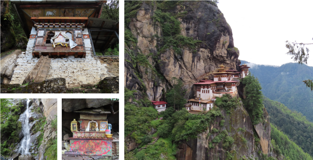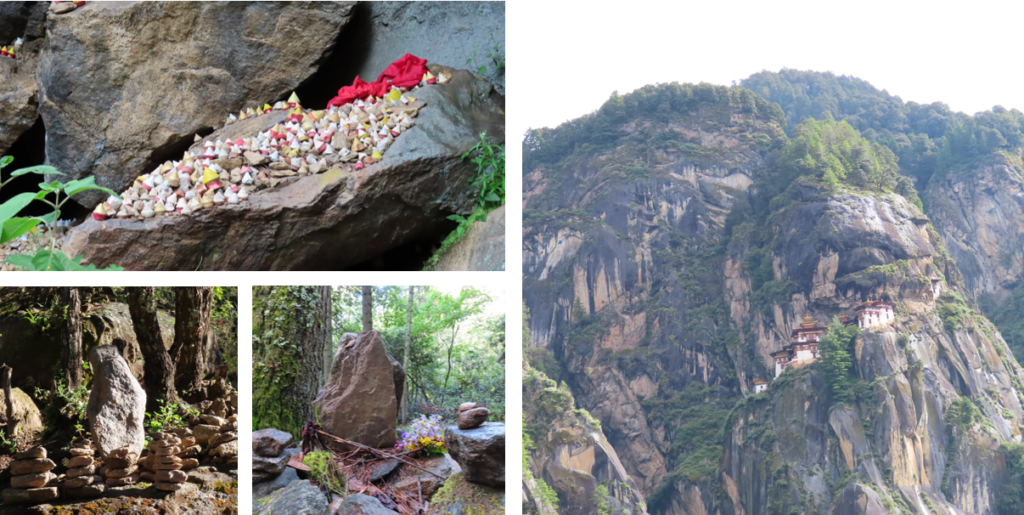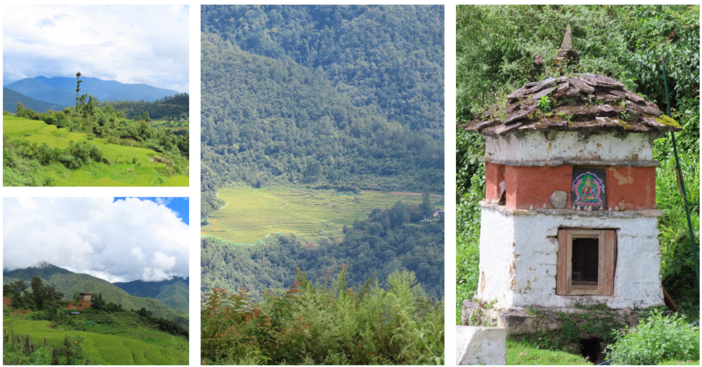 Niet veel verder vanaf deze tempel ligt de Kuje Lhakhang tempel, dit konden wij te voet afleggen. Langs de rijstvelden, over een karrespoor, loslopende koeien, stoepa’s en kleine tempels, alles passeerde ons pad. Na een klein half uurtje kwamen wij al aan bij de grootste tempel tot nu toe. De tempel is één van de belangrijkste in Bhutan, in de tempel vind je de lichaamsafdruk van Guru Rinpoche. Het tempelcomplex bestaat uit drie geschakelde gebouwen, waarvan de rechtse de meest oude is. Dit deel is gebouwd in 1652, in de tempel staan 1.000 kleine beelden van Guru Rinpoche. Het belangrijkste beeld is uiteraard ook van Guru Rinpoche. Achter het beeld is de meditatie grot waar hij zijn lichaamsafdruk heeft achtergelaten. De tweede, middelste tempel is gebouwd in 1900 door de eerste koning van Bhutan. De derde tempels is vervolgens in 1984 gebouwd door de vrouw van de derde koning. In de laatste twee tempels zijn wij niet binnen geweest. Net buiten de tempel in een rots een kleine inham met daarin veel kleine gedenkstoepaatjes.