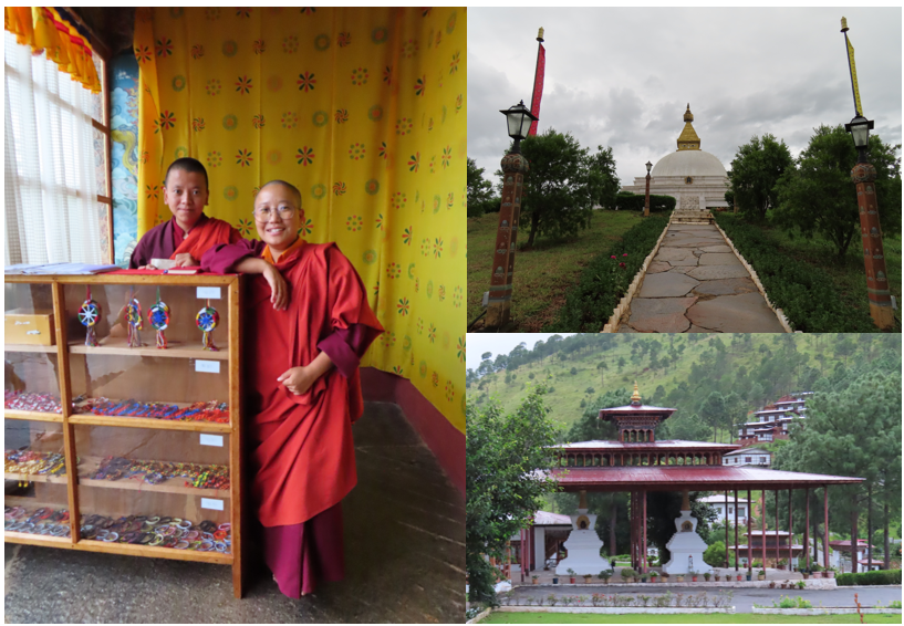 Op naar onze laatste top op onze route naar Punakha, het nonnenklooster “Sangchen Dorji Lhendrub Cheling Nunnery”. Op een agressief blaffende hond na, was het er vrij rustig. Er verblijven 120 nonnen en het klooster is opgericht door de schoonvader van de vierde koning (degene met de vier vrouwen). Na zijn dood werd zijn as verwerkt in de twee stoepa’s die bij de ingang staan en een deel werd verwerkt in de mooi reliek in de tempel. Achter de tempel ligt een stoepa in Nepalese stijl, een replica van de Bodnath stoepa in Kathmandu. Om de tempel heen staan nog wat kleinere ronde stoepa’s en daartussen de vertrekken van de nonnen. In de tempel vertelde de gids over het ontstaan van de tempel en een aanwezig vriendelijk non vertelde over het nonnenleven. Een non kan je pas worden vanaf 17 / 18 jaar en omdat zij op die leeftijd al een bewuste keuze kunnen maken, word je non voor het leven. Bij het weggaan uit de tempel een leuk gehaakt armbandje met de kleuren van de gebedsvlaggetjes gekocht, hiermee steun je de nonnen bij het onderhoud van hun tempel.
