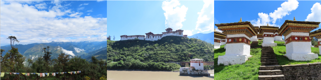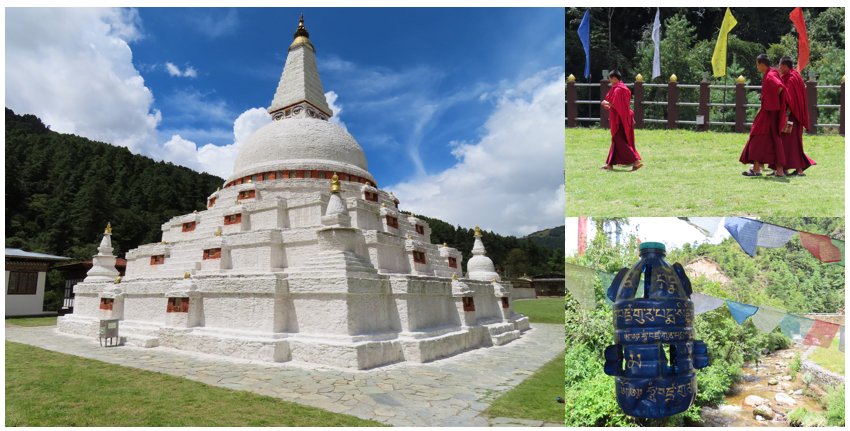 Vanaf hier werd de weg hier en daar wat slechter en op sommige stukken was de weg soms gewoon helemaal weggeslagen door landverschuivingen en moest de chauffeur glibberen door de modder. Overigens werd er op die stukken weg ook alweer hard gewerkt om deze goed berijdbaar te maken. Door het oponthoud bij de controlepost en de wat slechtere weg konden wij vrij laat pas aan onze lunch beginnen, maar de lunchplek maakte alles meer dan goed. Een picknick met mooi versierde tafels en stoelen, met een fantastisch uitzicht op de rivier en de omliggende bergen. In het nabijgelegen hotel konden wij in te tuin naar de wc, toen wist ik al genoeg, dat was geen happy toilet, verder was het er wel schoon. De lunch was heerlijk en hier ook voor het eerst de traditionele Bhutaanse Chili Cheese geprobeerd. Kaassaus met grote stukken Jalapeño pepers, lekker en pittig, dus voor de zekerheid maar een klein beetje genomen. Langs de weg, ook aan de overkant van onze lunchplek, worden de doden herdacht. Er worden 108 stoepaatjes gekleid waarin de as van de overledene wordt verwerkt, soms worden de stoepa’s ook nog rood/geel of rood/goud geverfd.