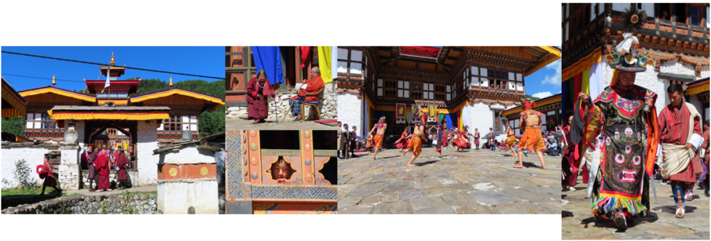 Best geslapen in mijn holletje onder de berg dekens. Het was nog wel redelijk vroeg, lekker op het balkon genoten van het uitzicht en de was buiten gehangen. Ontbijtje met scrambled egg, kippenworstje en aardappeltjes, vooral de worstjes waren erg lekker pittig, mjam. Gister in de bus terug had Jigme ons al een keuze gegeven, of twee uur terugrijden naar de Trongsa Dzong, nog wat andere tempels en het museum of naar een festival in een nabijgelegen dorp en daarna een bezoek aan twee tempels (strongly advised). Unaniem kozen wij voor de tweede optie. Het festival, The Fire Blessings (Mewang), vindt al sinds de 13e eeuw plaats. Er zijn feestelijkheden met zang, dans, muziek en kleurrijke kleding. Door drie keer over het vuur te springen geloven de Bhutanezen dat zij worden gezuiverd en dat zij het komende jaar beschermd zijn tegen pech en tegenslagen, tevens geloven zij in zegeningen voor een goede oogst, vrede en welvaart.