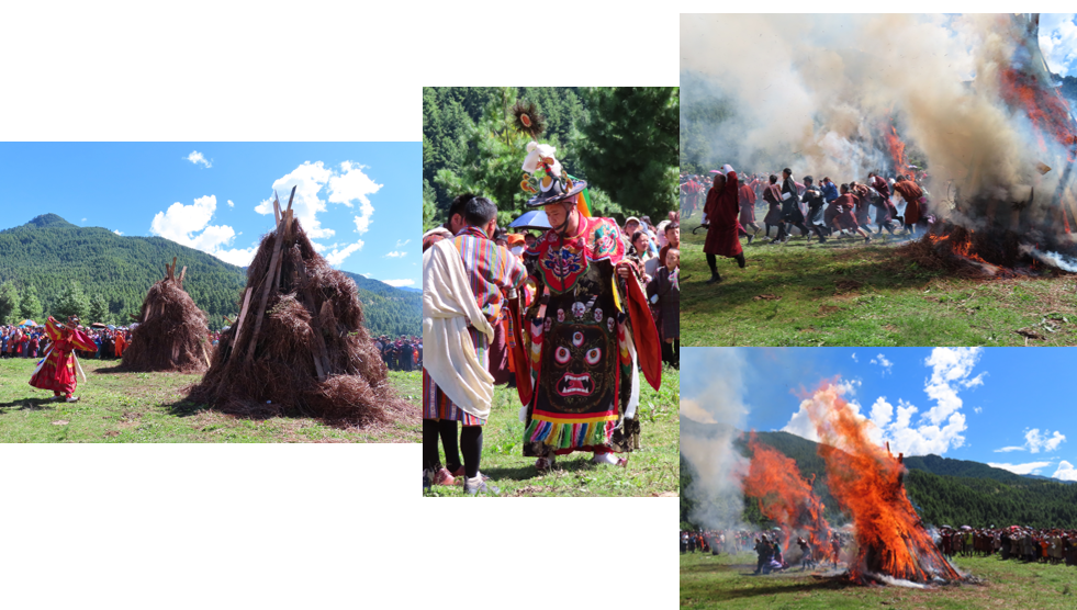 Iedereen mocht daarna aansluiten en wij verlieten de tempel naar het grasveld met de twee grote stapels met hout en stro. In een kring ging iedereen om de twee stapels heen staan en er werd nog een vuurceremonie uitgevoerd, de stapels werden aangestoken en de hitte was meteen intens. De kring werd groter en vanaf één kant van de stapels begonnen de Bhutanezen tussen de twee stapels door te rennen om vervolgens achteraan weer aan te sluiten en het ritueel nog twee keer te herhalen. Op een gegeven moment stortte één van de twee stapels in, dat ging maar net goed! De hitte nam wat af en het vuur begon uit te branden. Na een afsluitende ceremonie op het veld, liep iedereen achter de spiritueel leider weer aan het tempel plein op, daar ging de ceremonie weer verder met gemaskerde dansers. Ik had het wel even gezien met de ceremonie en ging nog even buiten het tempelplein kijken. Daar was een kleine, gezellige braderie en een kinderkermis. Voor de volwassenen, met name voor mannen, was er darten, een balletje in een gaatje spel (gokspel) en uiteraard boogschieten. Bij een stalletje water en lyche sap gekocht, even wat suiker in de warmte en door mijn water was ik inmiddels ook wel heen. Op de braderie een key-koord gekocht met de gezellig gekleurde gebedsvlaggetjes. Vanuit de tempel klonk weer wat andere muziek en ik ging nog even terug. De dames van het ontvangstcomité waren nu sierlijk aan het dansen. Langs het middenpad vond ik nog een gaatje om te zitten. Niet veel later ging een groep Bhutanese mannen weg en ik kreeg front-row een houten krukje aangeboden, wat een mazzel! Er werd iets van kleine broodjes gezegend en deze werden door de gemaskerde dansers uitgedeeld aan met name kinderen. De ceremonie was voor nu even klaar.