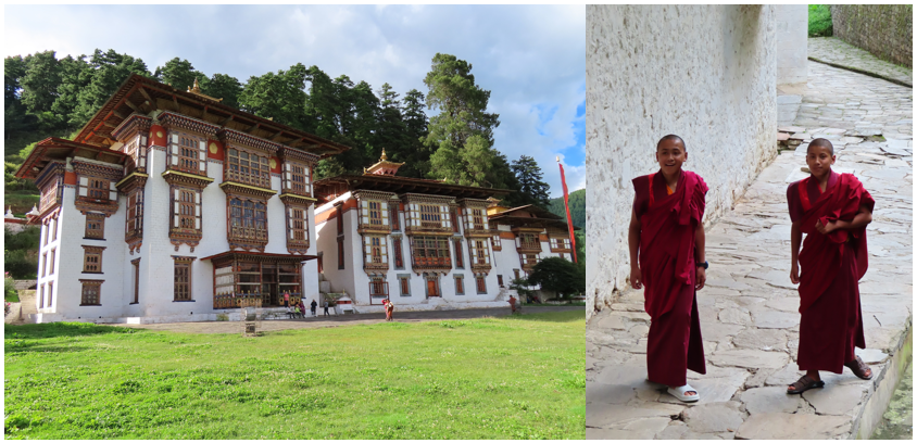 Heerlijk geslapen en redelijk bijtijds weer wakker, rustig aan opgestart, ontbijtje erin, tassen in de truck en alweer op weg naar ons volgende hotel, wat gaat deze reis gevoelsmatig snel! Het wordt vandaag een lange reisdag naar Bumthang, zo een zeven a acht uur inclusief stops. De eerste stop was er eentje met thee en lekkere koekjes in een mooie ruimte van een hotel. De kozijnen gezellig geschilderd en een kast met leuke snuisterijen waar een deel van de groep goed op los ging. Wij passeerden verschillende dorpjes en klommen alweer aardig omhoog. Bij een mooie grote Nepalese stoepa, een kopie van de Swayambhunath in Kathmandu, hadden wij een sanitaire stop. De WC was niet echt super, de omgeving was dan wel weer leuk. De Chendebji Chorten, de officiële naam van de stoepa, werd eind 19e eeuw gebouwd om de overblijfselen van een kwade geest te kunnen begraven. Het complex is best groot, een fijn grasveld waar je mag kamperen en picknicken (voor ons nog te vroeg, helaas). Er verblijven ook monniken en deze hadden les in één van de gebouwtjes. De bel ging en de deuren vlogen open, de monniken kwamen naar buiten, vrolijk zwaaiend op weg naar hun lunch.