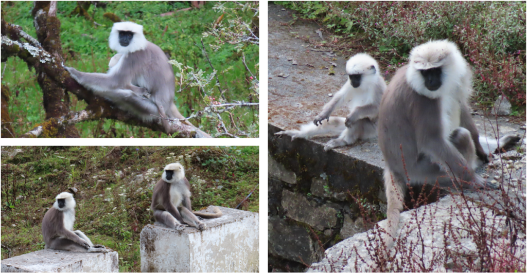 Wij reden weer verder over de highway en net voordat wij de volgende pas zouden overrijden, kwamen wij eindelijk een yak tegen. De yak zag er erg slecht uit, vol vliegen en schurftige plekken. Normaal leeft de yak in een kudde, maar die was nergens te bekennen, dat is geen goed teken. Niet veel later werden wij op ons volgende dier, de Gouden Langooraap getrakteerd. Dagen ben je aan het speuren en nu beide kort op elkaar, leuk! De hele bus werd lyrisch en nog lyrischer toen bleek dat het een grote groep Langoorapen met jongen was. Jigme liet de bus stoppen, vanaf daar konden wij de apen goed zien en was het niet ver meer de pas op waar wij toch al zouden stoppen. De Langooraap is een bedreigde diersoort en komt alleen in hier in Bhutan in de natuur voor. In de zomer kleuren de apen zilverwit en in de winter kastanjebruin.