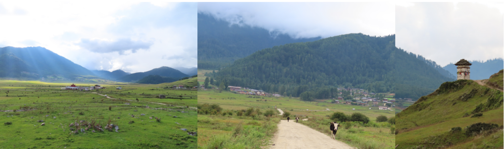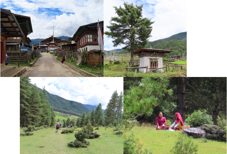 Na het bezoekje aan het vervallen toilet liepen wij de heuvel af door het dorp Gangtey, ook wat leuke winkeltjes dus we liepen wat vertraging op. Verder was het langs de weg naar beneden een druk gedoe. De braderie van de vorige dag werd opgeruimd en de kleine vrachtwagentjes reden af en aan. Er lag ook best veel troep op de grond en dat is voor Bhutan wel even wennen. Achter de braderie liep een pad naar beneden. Door de regenval van de nacht was het best glibberig geworden en was het goed oppassen. Via een mooie groene vlakte liepen wij het dennenbos in. Het pad slingerde lekker door het bos heen en was goed begaanbaar en redelijk vlak. Na het bos kwamen wij bij een hutje vanaf waar je een mooi uitzicht over de vallei hebt. Na het hutje vervolgende wij het pad weer door het groene dal en uiteindelijk kwamen wij op het pad met de stoepa waar wij de vorige dag ook even waren geweest. De groep was inmiddels best uiteengerukt en ik liep ergens lekker alleen genietend in het midden. Via de vlonders en het klooster kwam ik bij het hek, dat stond nu gelukkig en dus geen geklauter over de houten trap, fijn! Het karrespoor slingert zich om het weilandje heen, ik hand niet veel zin om helemaal om te lopen, het begon ook weer wat te regenen. Ik besloot een short cut over het weiland te nemen. Aan het begin was de short cut wat drassig, maar met snelle lichte stappen goed te doen. In het middenstuk werd het toch allemaal nog wat drassiger en bij de volgende stap zakte ik tot mijn knie de drassige grond in. Voor mij een plankje in het gras waarop ik mijzelf kon opvangen en mijn achterste voet stond nog redelijk stabiel. Ik voelde dat mijn been wat werd vastgezogen. Met alle kracht en goede plop trok ik mijn been uit de drassige grond. Mijn schoenen had ik gelukkig tot boven mijn enkels vastgeknoopt anders was ik de ene toch echt wel kwijt geweest. Zo snel als mogelijk en via plankjes en stenen begaf ik mij naar de overkant van het weiland, naar het karrespoor. Oef, die short cut was niet zo handig! Over het karrespoor liep ik terug naar het hotel, vurig hopend dat er niemand in de lobby zou zitten en ik naar mijn kamer kon sneaken. Helaas, ik moest toch even vertellen wat ik had uitgevreten en waarom ik er zo uitzag….. Daarna snel omgekleed, andere schoenen aan en door naar de lunch in het hotel.