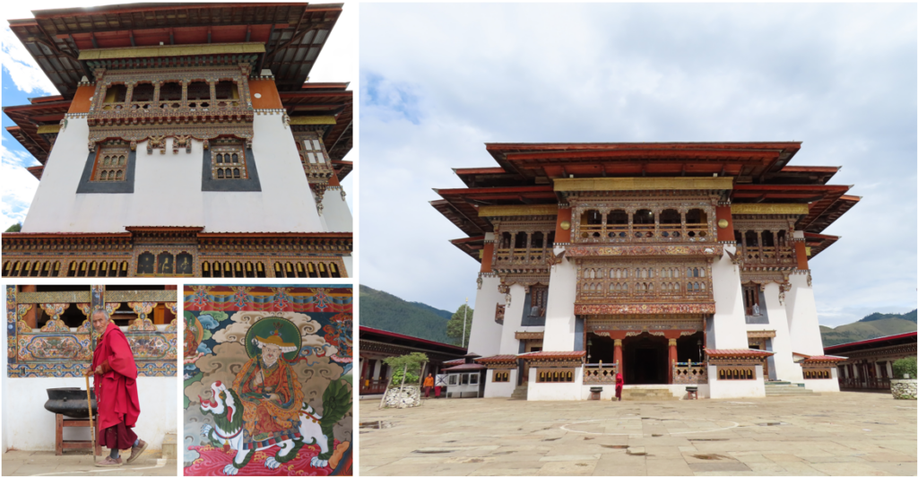 Met de bus gingen wij op weg. Bij de weg naar boven naar de volière bleek dat onze bus/Karma de draai niet kon maken. De wegen zijn echt krap hier, want zo groot is onze bus nu ook weer niet. Jigme besloot om de volière na de lunch te bezoeken, dan zou Karma een andere aanrijroute kiezen. Wij werden gedropt bij het Gangty klooster. Het klooster is in 1613 gebouwd boven op een heuvel en je hebt er een mooi uitzicht over de omliggende omgeving. Het was nog wel een beetje een zooitje in het hoofdgebouw en de monniken waren druk in de weer. De vorige dag was er een groot festival. Een belangrijke monnik was ook nog aanwezig en hij stond op het punt om uit één van de verblijven naar buiten te komen. Er stonden allemaal politieagenten klaar om hem een witte sjaal te overhandigen en vervolgens het dorp uit te begeleiden. Het wachten duurde wat lang en Jigme was al drie keer klaar met zijn uitleg. Wij gingen de hoofdtempel in, net toen wij binnen waren, zag de monnik zijn kans schoon en ging er vandoor. In de tempel vertelde Jigme nog wat over de geschiedenis. Het klooster is in 2001 na het ontdekken van een allesvretende houtkever volledig gerestaureerd naar zijn huidige status. Binnen staan de bekende beelden en zowel binnen als buiten mooie muurschilderingen.