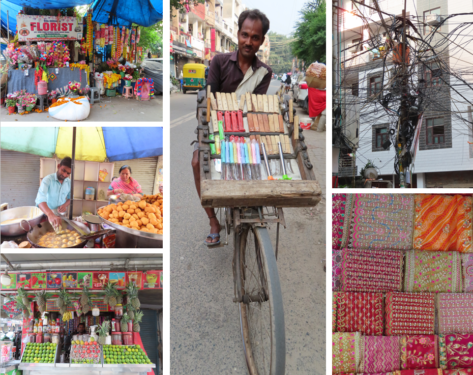 Voor de moskee stonden riksja’s voor ons klaar om ons door de nauwe straatjes van het voornamelijk oud Delhi te fietsen. Samen met Betsie klom ik aan boord bij een mannetje met lange sprietbenen en hij had er zin in. Hij startte als laatste maar wist ons handig langs alle andere riksja’s en toeterende scooters te krijgen naar een plekje bijna vooraan. De tocht duurde een klein kwartiertje en was vooral leuk om te doen, hebben verder niet veel bijzonders gezien. Na een leuke fooi voor de man met de sprietbenen gingen wij met de bus op weg naar het Mahatma Gandhi monument op Raj Ghat.