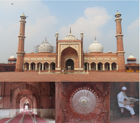 Voor de excursie stond er weer een hele grote witte bus klaar, de bus trekt behoorlijk wat bekijks, geef mij het kleine busje uit Bhutan maar. Onze eerste stop was bij de Jama Masjied Moskee, een vrijdagmiddagmoskee gebouwd door Mogel Sjah Jahan in 1656. Het is één van de grootste en bekendste moskeeën van India. Bij de ingang moesten onze schoenen uit en ondanks dat ik een lange rok en vest aanhad, moest er nog een flatteuze bruine jurk overheen, dat wordt zweten! Het is een mooie grote (openlucht) moskee, de gebouwen zijn mooi rood/crème wit. Het was er nog erg rustig. Op veel plekken mag je als toerist of vrouw alleen niet komen. Wij moesten het dus vooral doen met het buitenaanzicht in de nu al hete zon.