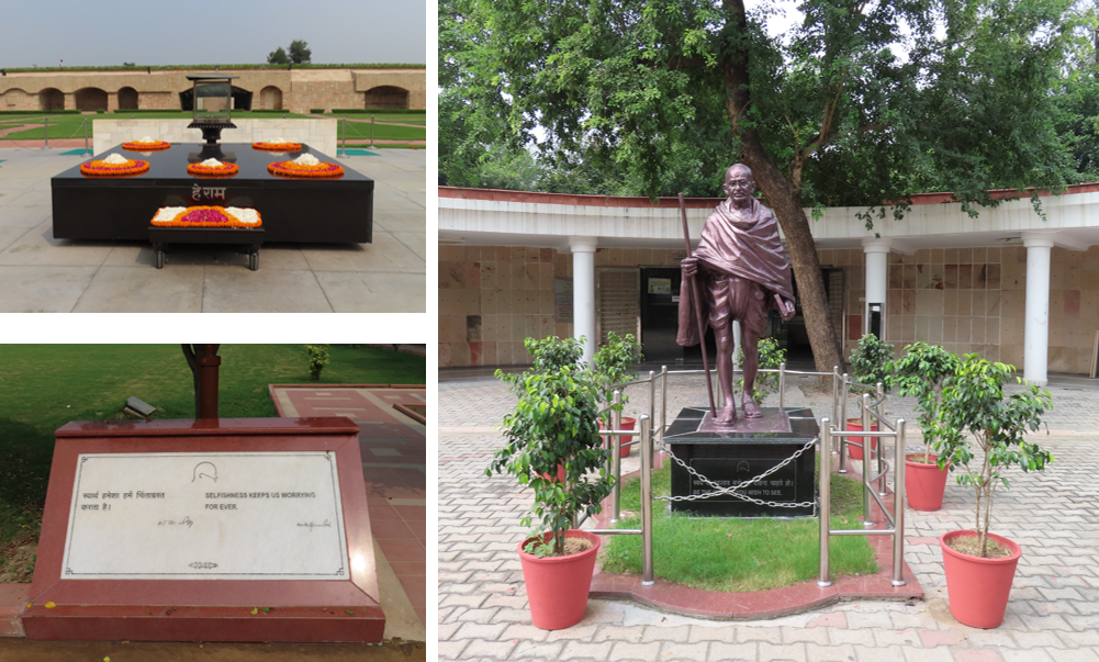 Er zijn hier meerdere gedenkplaatsen voor prominente Indiase leiders, maar wij gingen voor het eerste monument dat hier geplaatst werd, dat van Gandhi. Nadat hij in 1948 werd doodgeschoten, is hij op deze plaats gecremeerd. Het monument is een zwart marmeren platform met op de kopse kant de eeuwig brandende vlam. Op het monument liggen mooie oranje/witte bloemenkransen. Het monument bevindt zich binnen vier muren waar je overheen kunt lopen. Verder een paar bomen en een mooie groene grasmat. Het is een mooie serene plek. Aan de overkant van het ommuurde monument staat het standbeeld van Gandhi zoals hij in de laatste jaren uitzag.