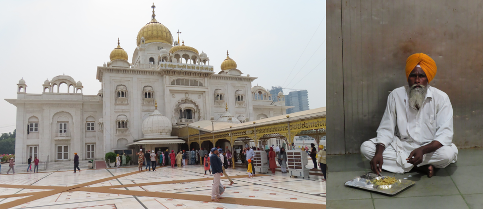 De bus bracht ons naar Gurudwara Bangla Sahib tempel. Eén van de grootste sikh tempels in Delhi. Toeristen moeten via een aparte ingang naar binnen. Mijn lange rok was te kort en ik moest er een poepbruine drollenvanger broek over aan. Onze haren moesten ook deels bedekt zijn en dus kregen wij nog een oranje zakdoek voor op ons hoofd. Gezellig gekleed en op blote voeten liepen wij de tempel in. De tempel is redelijk hoekig en in het midden zit een voorganger op een podium te bidden, er omheen zitten de sikh, mannen en vrouwen door elkaar. Na de gebedsruimte liepen wij door naar de gaarkeuken en de eetzaal. Iedereen mag hier een maaltijd nuttigen, als je maar gepast gekleed bent. De zaal zat vol met mensen op de grond in kleermakerszit. Het eten wordt er uitgedeeld door vrijwilligers en mensen die er zelf net gegeten hebben. In de gaarkeuken wordt het eten bereid, de vrouwen bakken de naanbroden en de manen staan in grote ketels te roeren. Via een raam naar de eetzaal worden de pannen meegenomen zodat het eten in de zaal uitgedeeld kan worden. Het zag er allemaal best wel lekker uit. In het midden van het complex ligt een mooie vierkante vijver, de Saravar. Volgens de verhalen genezen mensen in de heilige vijver van de pokken en cholera. De tempel heeft mooie gouden koepels, wit met gouden muren en is gebouwd in 1664. Al met al een bijzondere en mooie tempel om te bezoeken.