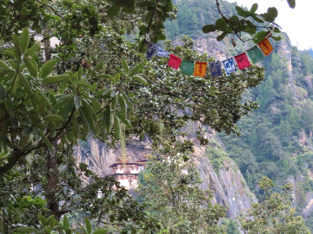 Het rotsen pad begint redelijk rustig met omhoog gaan. In totaal gaan wij ongeveer 6,5 kilometer heen afleggen en zo een 500 meter stijgen. Op het hoogste punt zitten wij dan op 3.000 meter. Daarna alles weer terug, maar eerst omhoog! Het pad werd smaller en was meer bedekt met stevig aangetrapte modder. Wij liepen het bos in, beekje over en langs drie gezellige tempeltjes, so far so good. Niet veel later kwamen er wat meer trappen met de welbekende ongelijke Aziatische treden en begon het warmer te worden. Mijn stijgconditie is niet de beste, op de één of andere manier krijg ik mijn ademhaling niet onder controle waardoor ik vaak even moet stoppen om daarna wel weer snel op adem te komen. Gelukkig hadden Jeroen en Irene hetzelfde tempo en kon ik gezellig met hun meelopen. Onderweg veel gebedsvlaggetjes, gestapelde stenen en kleurrijke bundels touw. Na elke slinger ook weer een ander zicht op het Tijgersnest en hij kwam ook steeds, hetzij langzaam, dichterbij. Bij de gezellig gekleurde gebedsmolens wat langer rust gehouden en ze natuurlijk ook even een flinke slinger gegeven. De koffiebar met uitzicht op het Tijgersnest is ook niet ver meer. Via een nagenoeg vlak pad loop je er zo naartoe.