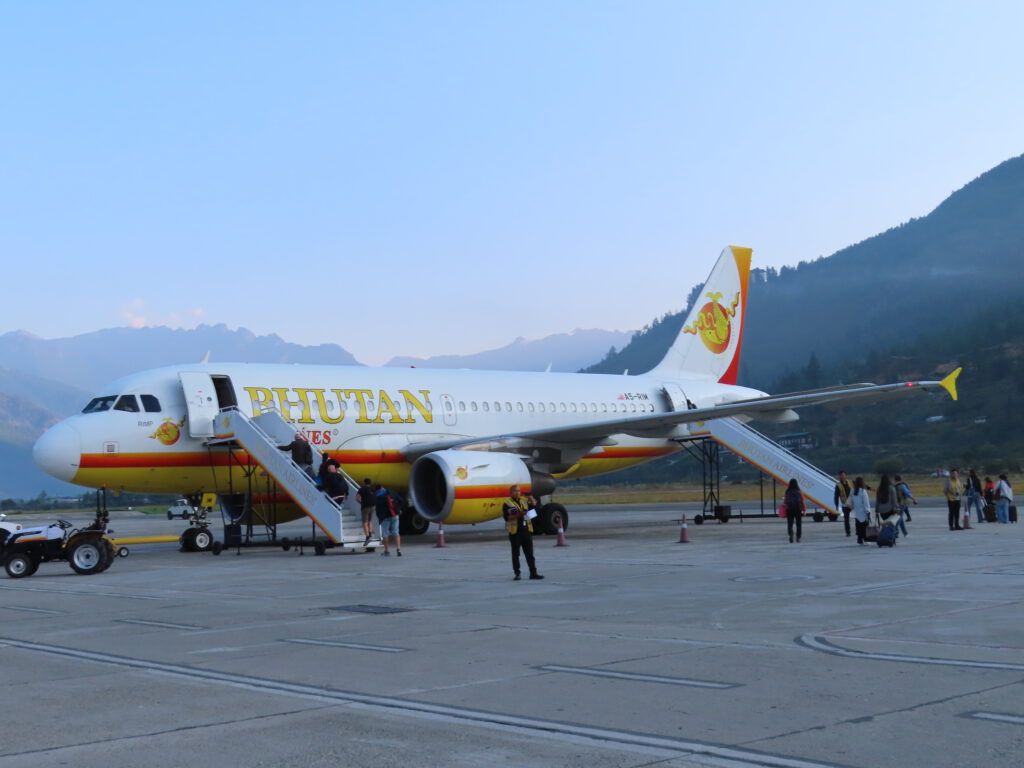 Tja, daar gaan wij dan, vroeg de wekker, half vier, want om tien voor vier worden de tassen ingeladen door Chorten. Het hotel had voor ons ontbijtpakketjes gemaakt, een appel, pakje mangosap, boterham met salade en een gekookt ei. Voor nu zit dat wel even goed in mijn tas, had nog niet veel trek. Ondanks het vroege uur was het best druk op de weg, zeker voor Bhutanese begrippen. De toegangspoort naar het vliegveld is gebouwd in Bhutanese stijl, zo ook het hele luchthaven gebouw. Buiten voor de laatste keer afscheid genomen van de drie-eenheid en daarna gingen wij op weg naar het drukke en chaotische India, New Delhi. Een check bij de ingang en daarna door naar de bagage afhandeling. Ik kwam er gelukkig net op tijd achter dat mijn powerbank nog in mijn grote rugzak zat. Tas weer even terug en hop alles in mijn kleine rugzak. De vertrekhal is mooi en in een lounge hoekje op een lekkere zachte banken de boardingtijd afgewacht. Een paar hapjes van het broodje, echt trek had ik nog niet. Het pakje drinken moest ik al bij de security laten staan. De gate ging open en wij moesten vanaf de vertrekhal zelf naar het vliegtuig lopen wat eigenlijk best wel heel leuk was. Alle vluchten staan in Paro in de ochtend gepland, zodat bij slecht weer de vlucht nog makkelijk naar een later of zelfs de volgende ochtend kan worden verplaatst. Het ietwat dringende advies luidt ook, boek een aansluitende vlucht minimaal 24 uur later, de reden dus ook dat wij nog even een dag in Delhi moeten vertoeven. De piloten die hier vertrekken en aankomen zijn speciaal getraind en er zijn er maar weinig van. De aanvliegroute (en vertrek) is uit en dal omringd met hoge bergen, de Himalaya. De piloten vliegen alleen op zicht, instrumenten zoals hoogtemeters kunnen hier lastig worden gebruikt.